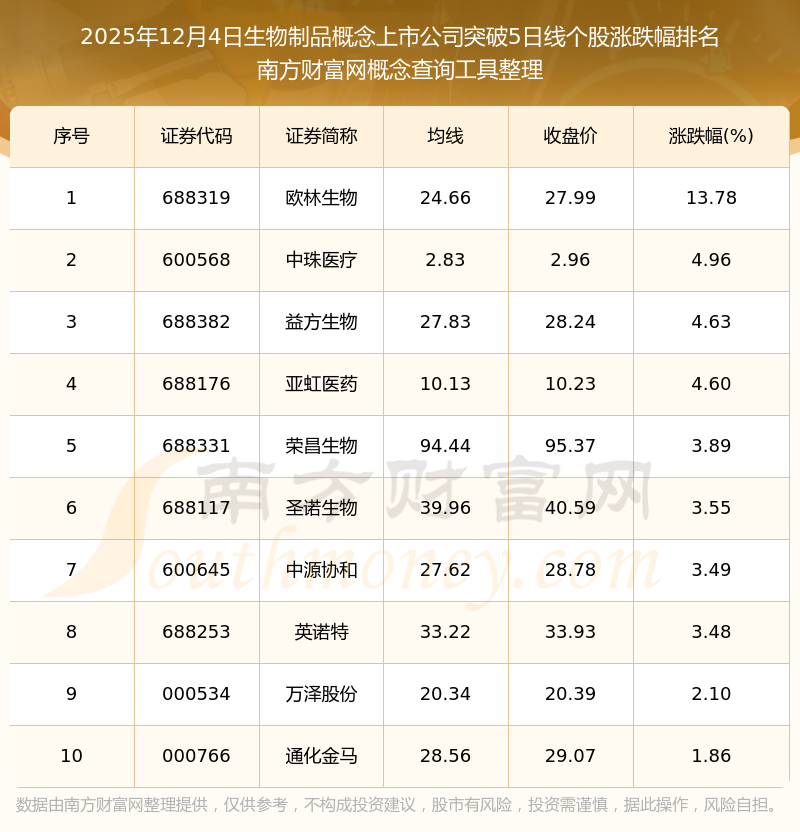 根据南方财富网概念查询工具数据统计,截止2025年12月4日收盘,生物制品概念上市公司共有11只个股收盘价向上突破了5日线。其中涨幅较大的个股有欧林生物、中珠医疗、益方生物等,涨幅分别为13.78%、4.96%、4.63%。