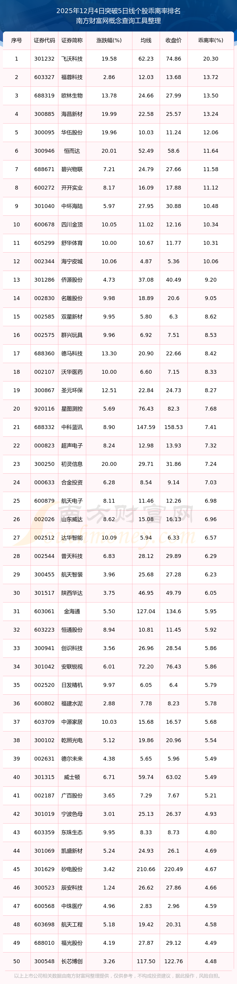 2025年12月4日突破5日线个股乖离率排名