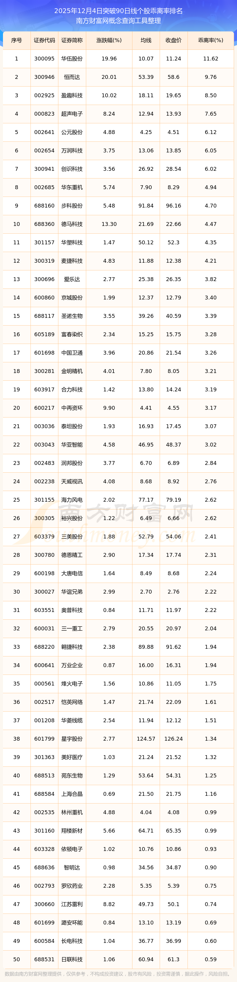 根据南方财富网概念查询工具数据统计,截止2025年12月4日收盘,共有66只个股收盘价向上突破了90日线,其中乖离率较大的个股有华伍股份、恒而达、盈趣科技、超声电子、公元股份等,乖离率分别为11.62%、9.76%、8.50%、7.65%、6.12%。