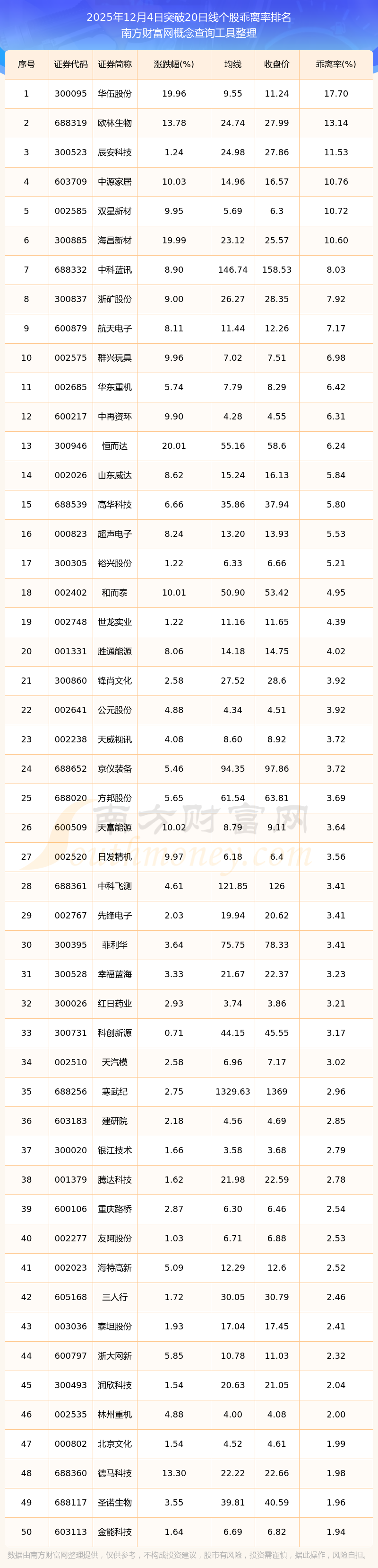 根据南方财富网概念查询工具数据统计,截止2025年12月4日收盘,共有99只个股收盘价向上突破了20日线,其中乖离率较大的个股有华伍股份、欧林生物、辰安科技、中源家居、双星新材等,乖离率分别为17.70%、13.14%、11.53%、10.76%、10.72%。