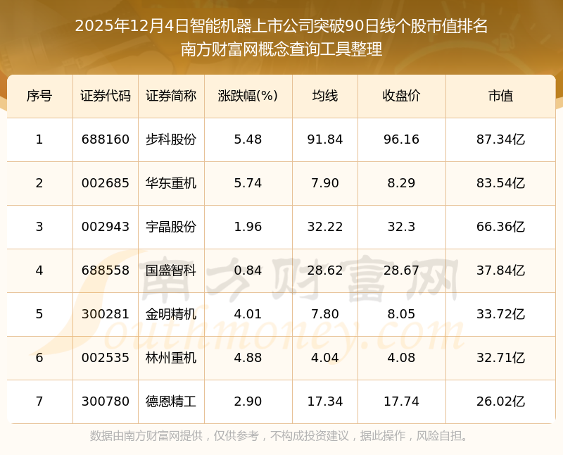 2025年12月4日智能机器上市公司突破90日线个股市值排名