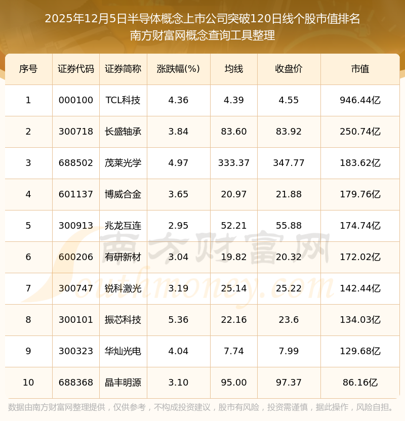 2025年12月5日半导体概念上市公司突破120日线个股市值排名