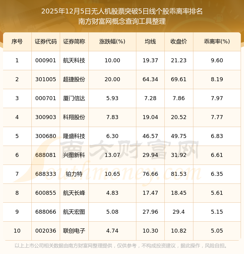 根据南方财富网概念查询工具数据统计,截止2025年12月5日收盘,无人机股票共有37只个股收盘价向上突破了5日线。其中乖离率较大的个股有航天科技、超捷股份、厦门信达等,乖离率分别为9.60%、8.19%、7.97%。