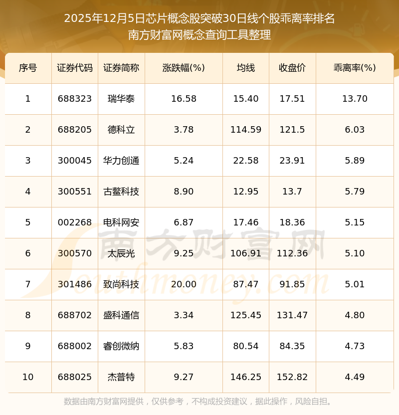 根据南方财富网概念查询工具数据统计,截止2025年12月5日收盘,芯片概念股共有27只个股收盘价向上突破了30日线。其中乖离率较大的个股有瑞华泰、德科立、华力创通等,乖离率分别为13.70%、6.03%、5.89%。