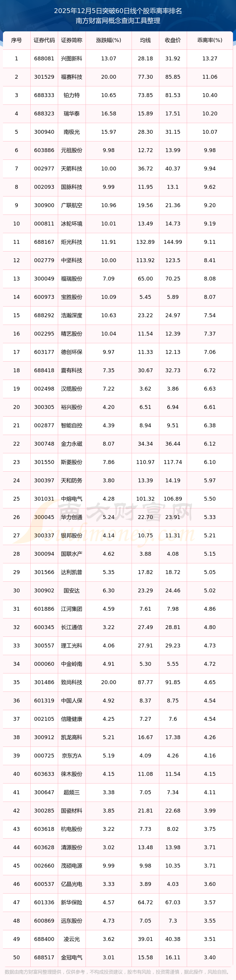 根据南方财富网概念查询工具数据统计,截止2025年12月5日收盘,共有116只个股收盘价向上突破了60日线,其中乖离率较大的个股有兴图新科、福赛科技、铂力特、瑞华泰、南极光等,乖离率分别为13.27%、11.06%、10.40%、10.20%、10.07%。