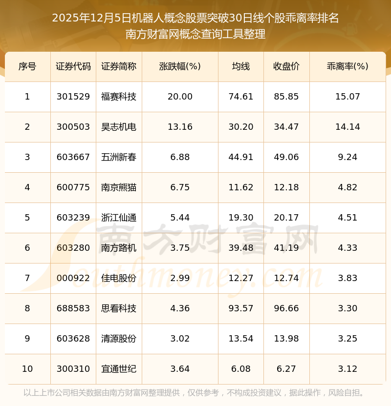 根据南方财富网概念查询工具数据统计,截止2025年12月5日收盘,机器人概念股票共有21只个股收盘价向上突破了30日线。其中乖离率较大的个股有福赛科技、昊志机电、五洲新春等,乖离率分别为15.07%、14.14%、9.24%。