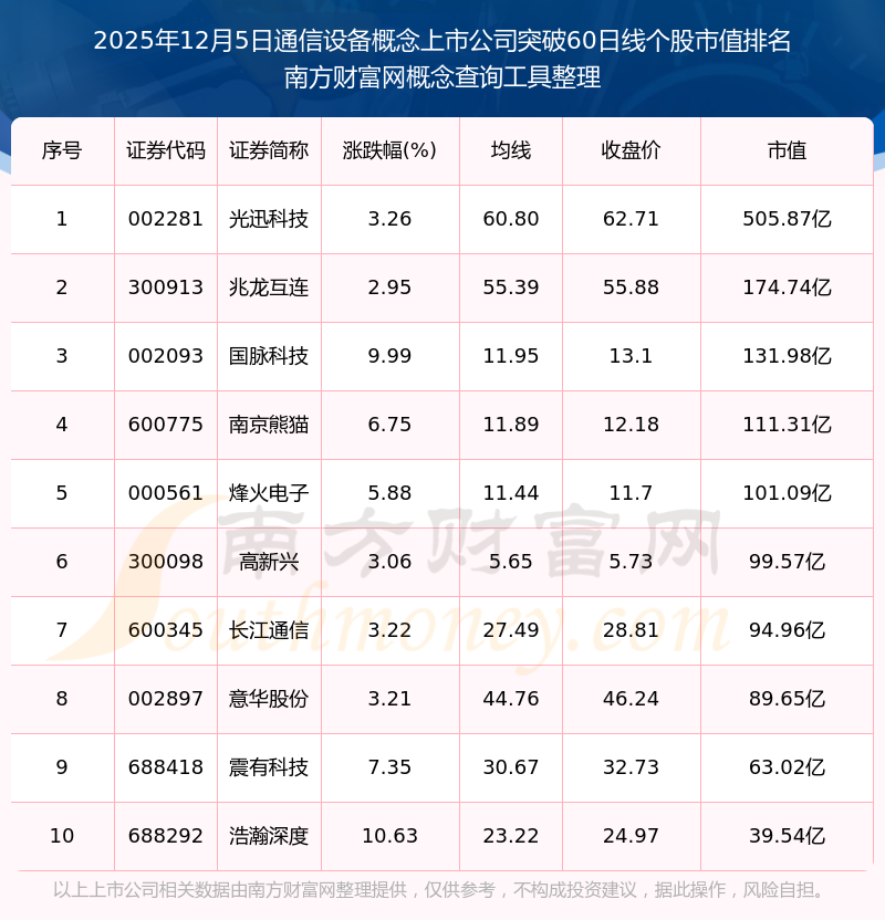 2025年12月5日通信设备概念上市公司突破60日线个股市值排名