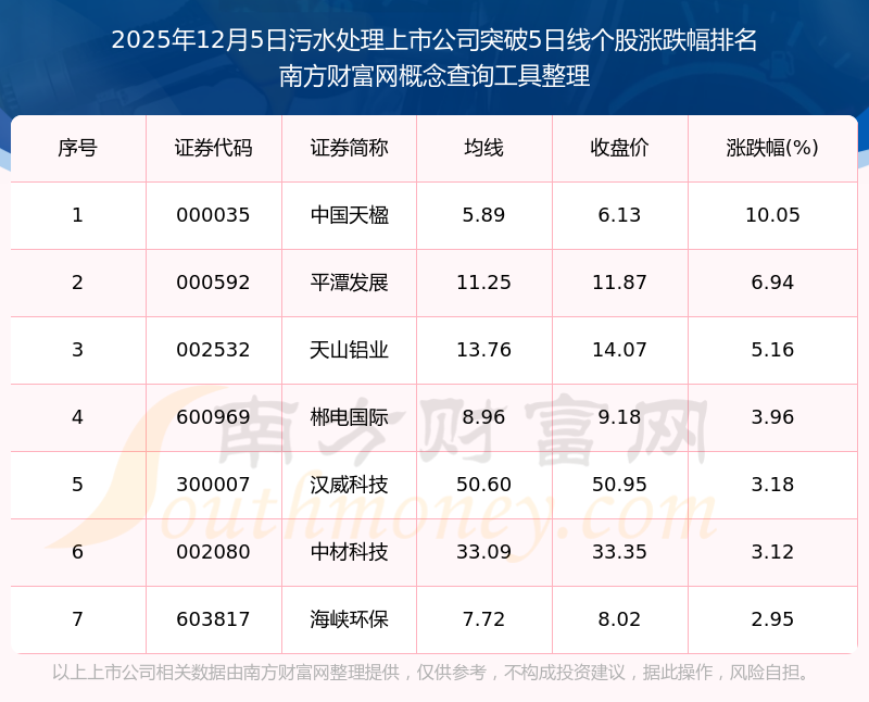 根据南方财富网概念查询工具数据统计,截止2025年12月5日收盘,污水处理上市公司共有7只个股收盘价向上突破了5日线。其中涨幅较大的个股有中国天楹、平潭发展、天山铝业等,涨幅分别为10.05%、6.94%、5.16%。