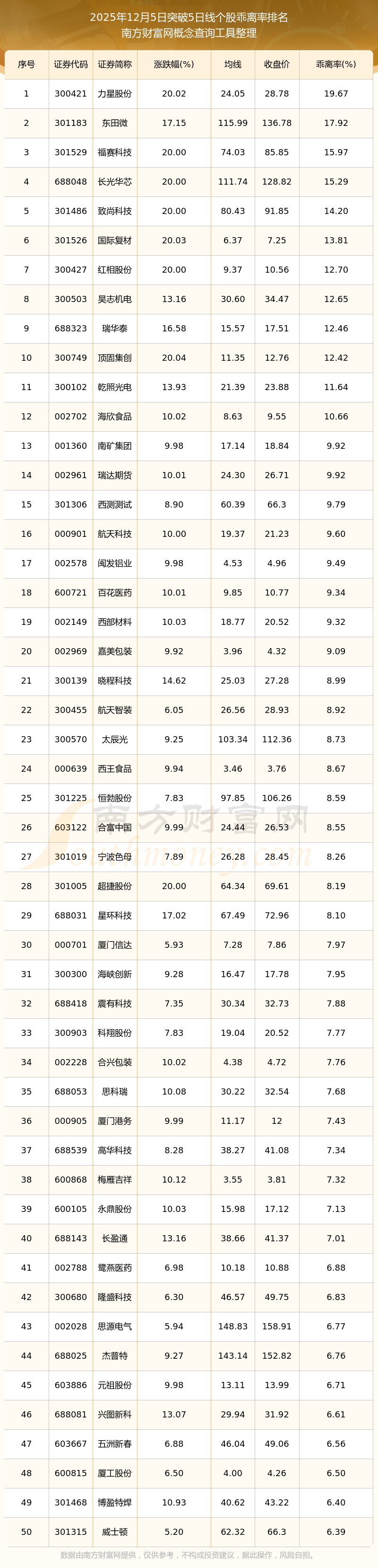 2025年12月5日突破5日线个股乖离率排名