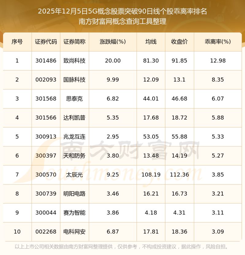 根据南方财富网概念查询工具数据统计,截止2025年12月5日收盘,5G概念股票共有19只个股收盘价向上突破了90日线。其中乖离率较大的个股有致尚科技、国脉科技、思泰克等,乖离率分别为12.98%、8.35%、6.07%。