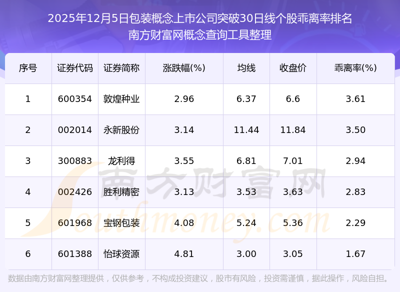2025年12月5日包装概念上市公司突破30日线个股乖离率排名