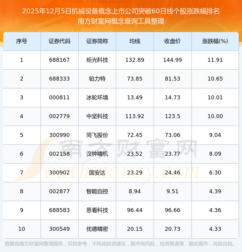 根据南方财富网概念查询工具数据统计,截止2025年12月5日收盘,机械设备概念上市公司共有19只个股收盘价向上突破了60日线。其中涨幅较大的个股有炬光科技、铂力特、冰轮环境等,涨幅分别为11.91%、10.65%、10.01%。