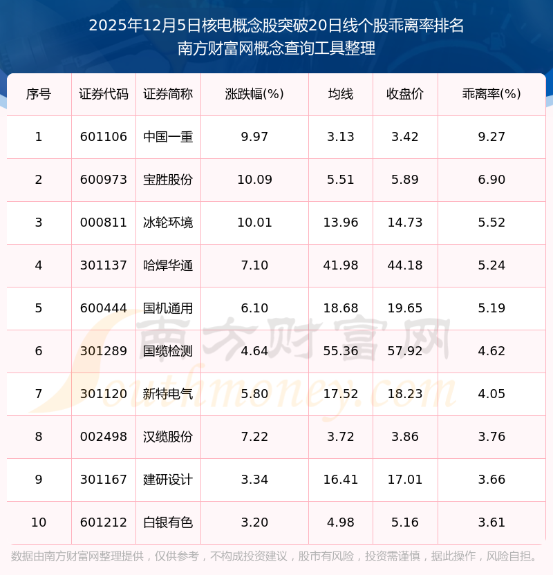 根据南方财富网概念查询工具数据统计,截止2025年12月5日收盘,核电概念股共有17只个股收盘价向上突破了20日线。其中乖离率较大的个股有中国一重、宝胜股份、冰轮环境等,乖离率分别为9.27%、6.90%、5.52%。
