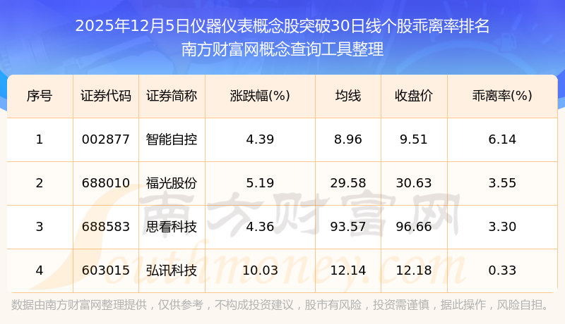 根据南方财富网概念查询工具数据统计,截止2025年12月5日收盘,仪器仪表概念股共有4只个股收盘价向上突破了30日线。其中乖离率较大的个股有智能自控、福光股份、思看科技等,乖离率分别为6.14%、3.55%、3.30%。