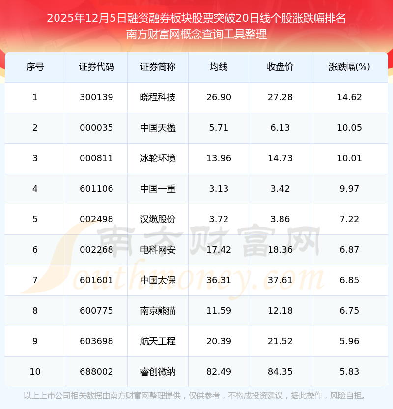 根据南方财富网概念查询工具数据统计,截止2025年12月5日收盘,融资融券板块股票共有42只个股收盘价向上突破了20日线。其中涨幅较大的个股有晓程科技、中国天楹、冰轮环境等,涨幅分别为14.62%、10.05%、10.01%。