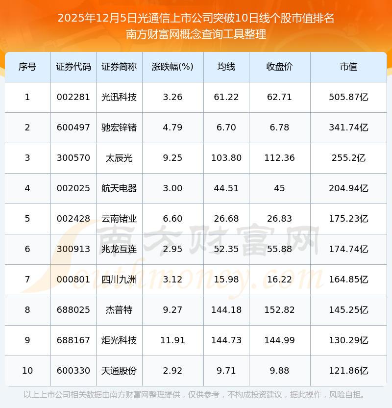 2025年12月5日光通信上市公司突破10日线个股市值排名
