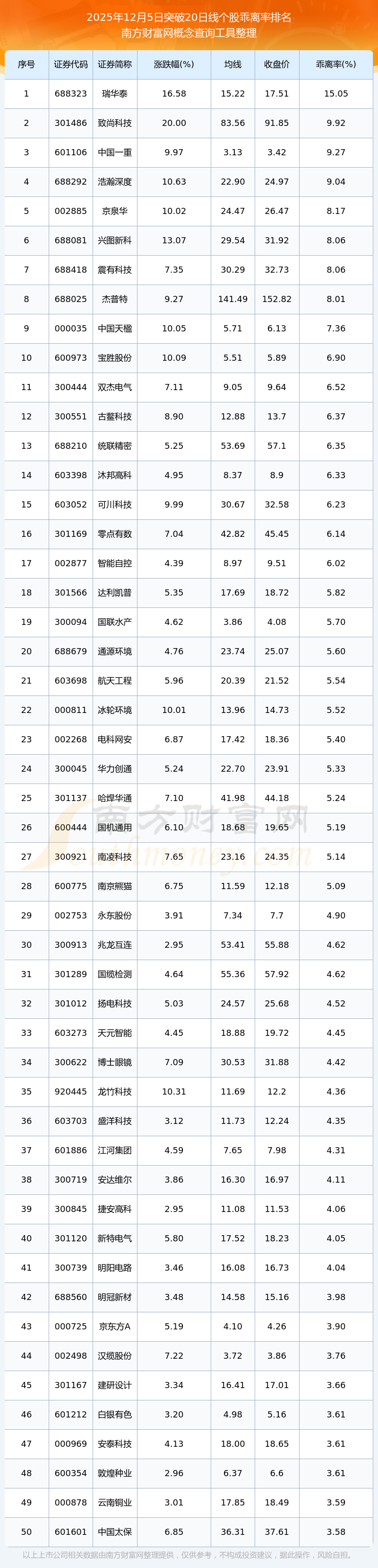根据南方财富网概念查询工具数据统计,截止2025年12月5日收盘,共有126只个股收盘价向上突破了20日线,其中乖离率较大的个股有瑞华泰、致尚科技、中国一重、浩瀚深度、京泉华等,乖离率分别为15.05%、9.92%、9.27%、9.04%、8.17%。
