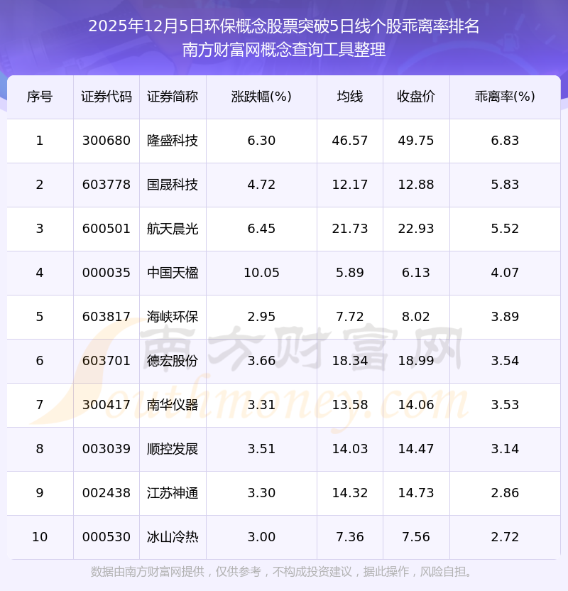 2025年12月5日环保概念股票突破5日线个股乖离率排名