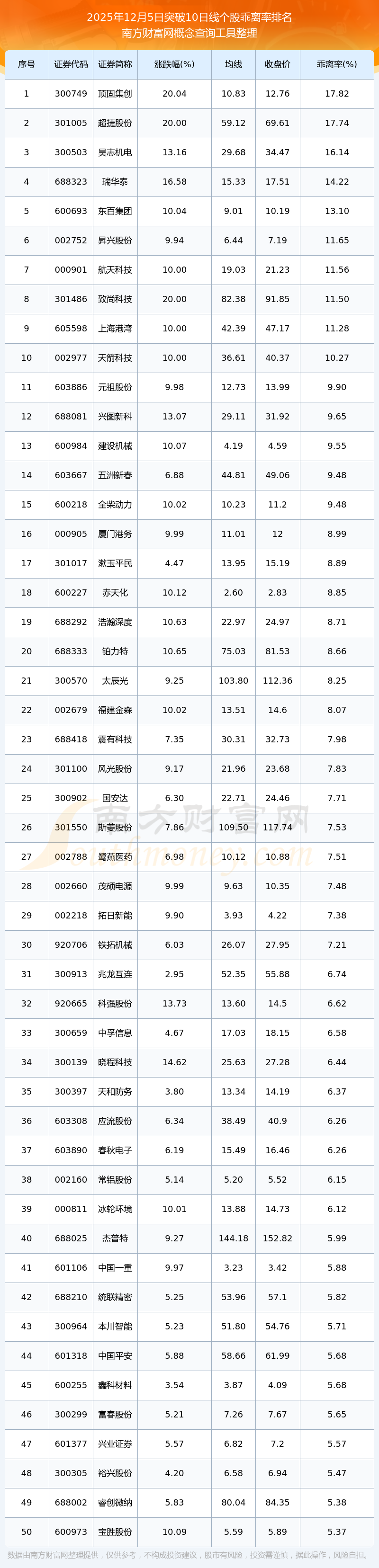 根据南方财富网概念查询工具数据统计,截止2025年12月5日收盘,共有218只个股收盘价向上突破了10日线,其中乖离率较大的个股有顶固集创、超捷股份、昊志机电、瑞华泰、东百集团等,乖离率分别为17.82%、17.74%、16.14%、14.22%、13.10%。