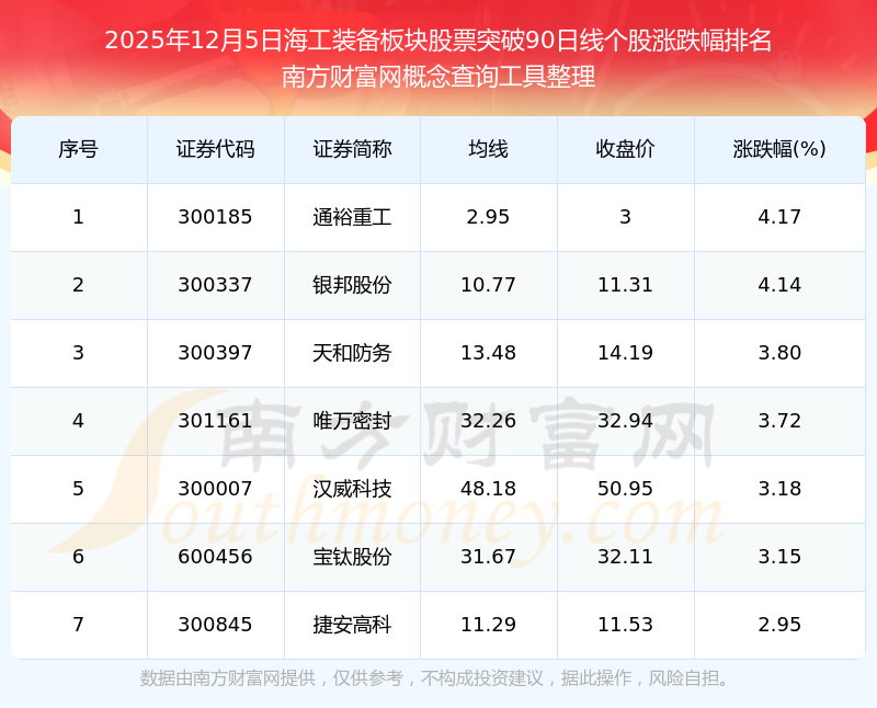 根据南方财富网概念查询工具数据统计,截止2025年12月5日收盘,海工装备板块股票共有7只个股收盘价向上突破了90日线。其中涨幅较大的个股有通裕重工、银邦股份、天和防务等,涨幅分别为4.17%、4.14%、3.80%。