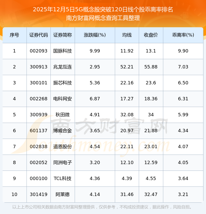 根据南方财富网概念查询工具数据统计,截止2025年12月5日收盘,5G概念股共有14只个股收盘价向上突破了120日线。其中乖离率较大的个股有国脉科技、兆龙互连、振芯科技等,乖离率分别为9.90%、7.03%、6.50%。