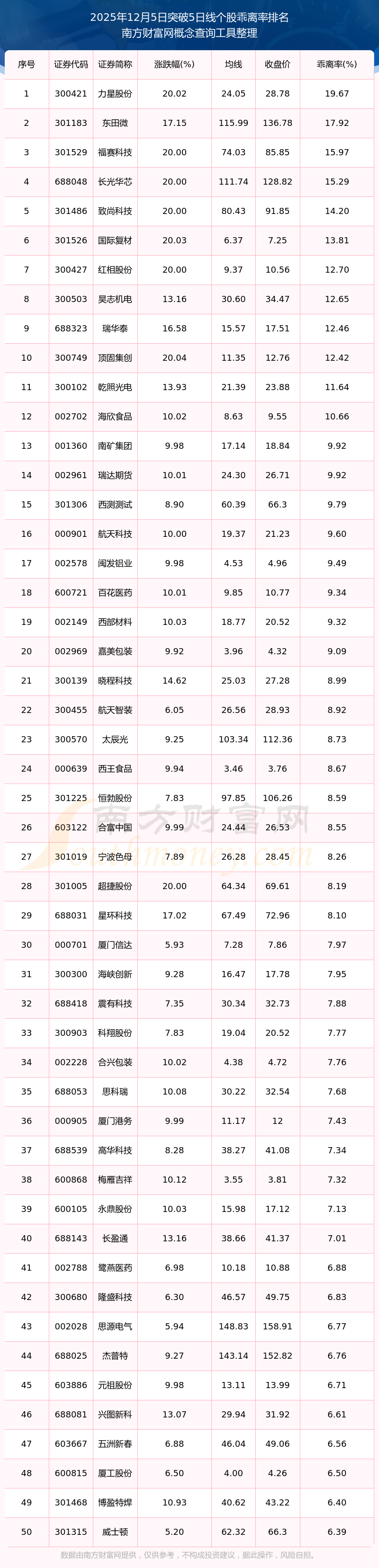 2025年12月5日突破5日线个股乖离率排名