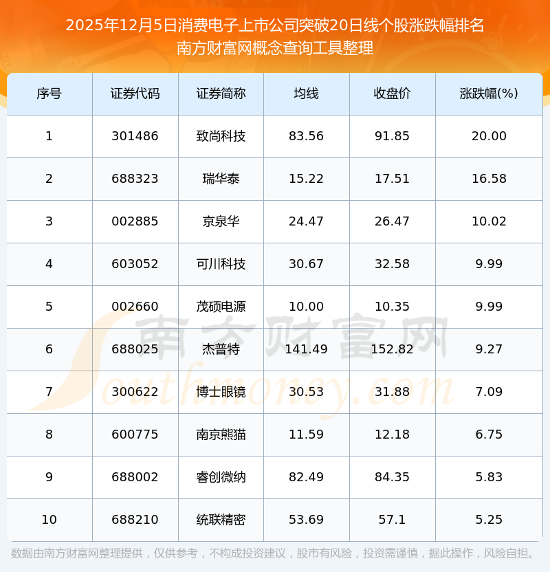 根据南方财富网概念查询工具数据统计,截止2025年12月5日收盘,消费电子上市公司共有17只个股收盘价向上突破了20日线。其中涨幅较大的个股有致尚科技、瑞华泰、京泉华等,涨幅分别为20.00%、16.58%、10.02%。