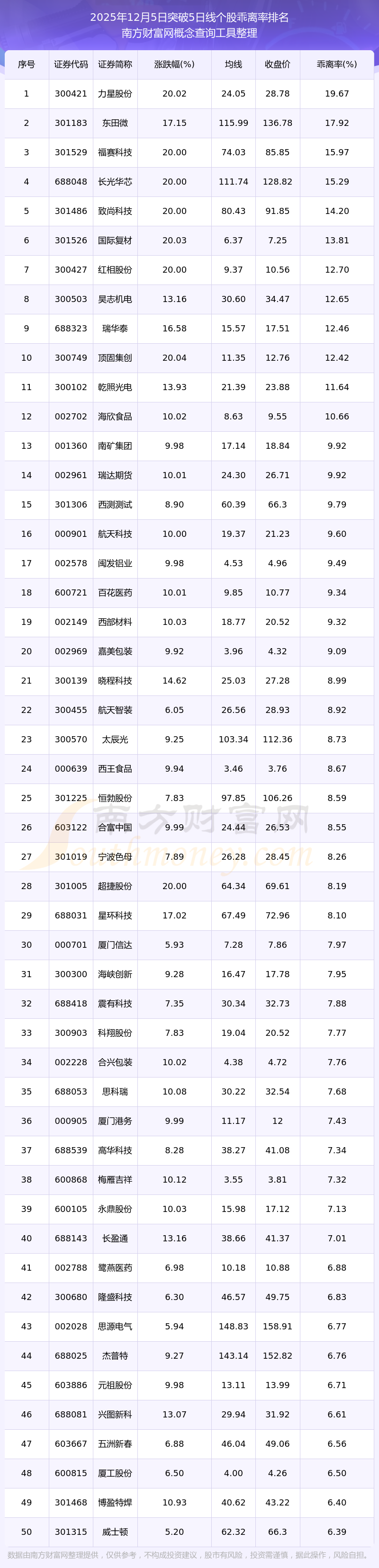 根据南方财富网概念查询工具数据统计,截止2025年12月5日收盘,共有331只个股收盘价向上突破了5日线,其中乖离率较大的个股有力星股份、东田微、福赛科技、长光华芯、致尚科技等,乖离率分别为19.67%、17.92%、15.97%、15.29%、14.20%。