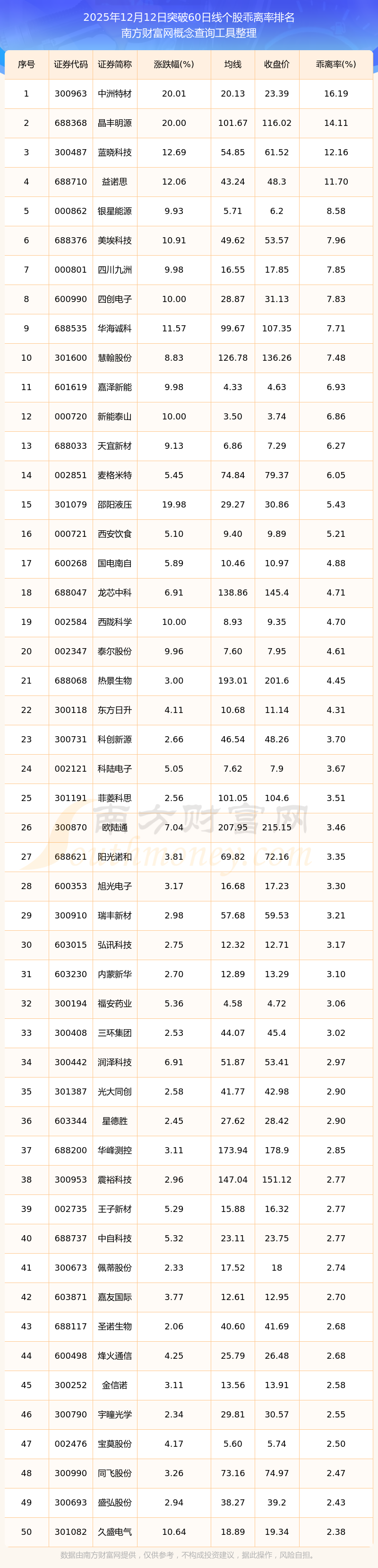 根据南方财富网概念查询工具数据统计,截止2025年12月12日收盘,共有103只个股收盘价向上突破了60日线,其中乖离率较大的个股有中洲特材、晶丰明源、蓝晓科技、益诺思、银星能源等,乖离率分别为16.19%、14.11%、12.16%、11.70%、8.58%。