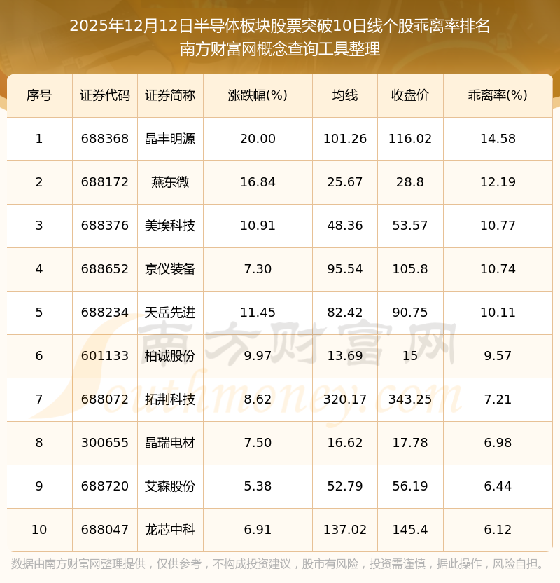 根据南方财富网概念查询工具数据统计,截止2025年12月12日收盘,半导体板块股票共有49只个股收盘价向上突破了10日线。其中乖离率较大的个股有晶丰明源、燕东微、美埃科技等,乖离率分别为14.58%、12.19%、10.77%。