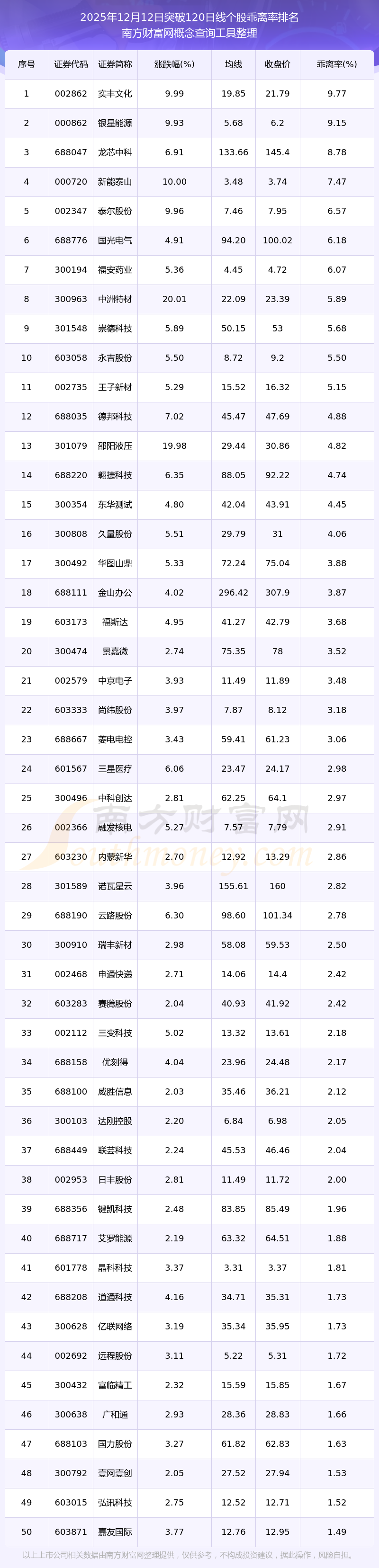根据南方财富网概念查询工具数据统计,截止2025年12月12日收盘,共有75只个股收盘价向上突破了120日线,其中乖离率较大的个股有实丰文化、银星能源、龙芯中科、新能泰山、泰尔股份等,乖离率分别为9.77%、9.15%、8.78%、7.47%、6.57%。