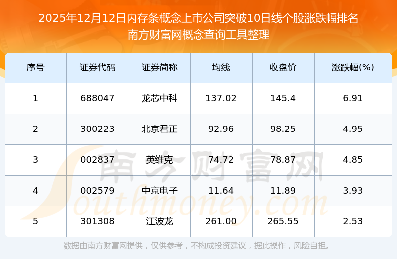 根据南方财富网概念查询工具数据统计,截止2025年12月12日收盘,内存条概念上市公司共有5只个股收盘价向上突破了10日线。其中涨幅较大的个股有龙芯中科、北京君正、英维克等,涨幅分别为6.91%、4.95%、4.85%。