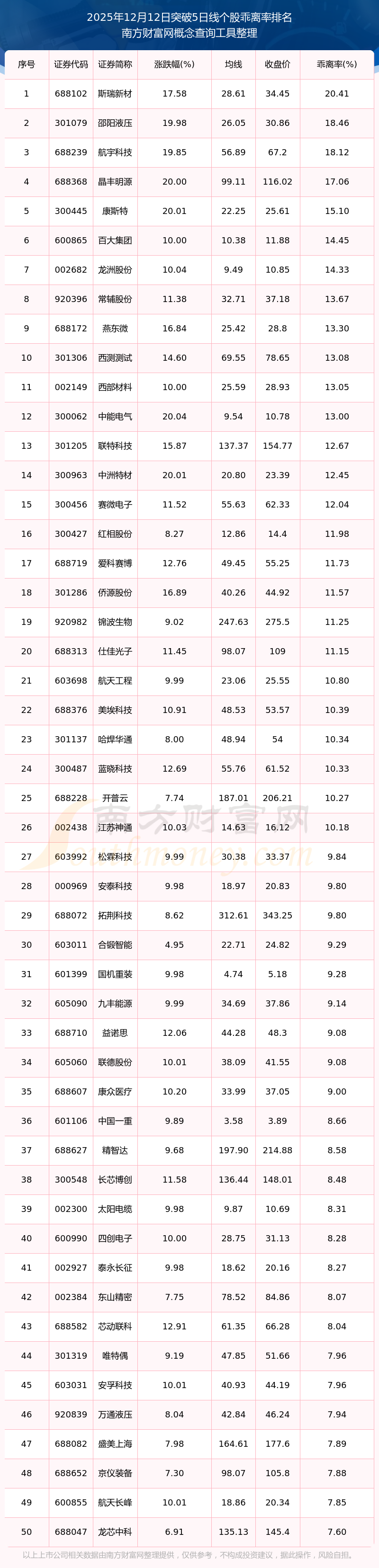 根据南方财富网概念查询工具数据统计,截止2025年12月12日收盘,共有404只个股收盘价向上突破了5日线,其中乖离率较大的个股有斯瑞新材、邵阳液压、航宇科技、晶丰明源、康斯特等,乖离率分别为20.41%、18.46%、18.12%、17.06%、15.10%。 2025年12月12日突破