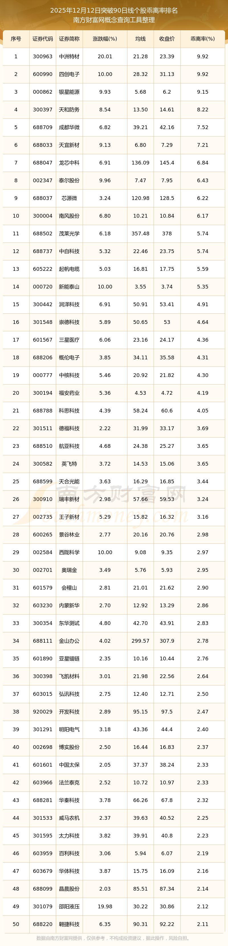 根据南方财富网概念查询工具数据统计,截止2025年12月12日收盘,共有80只个股收盘价向上突破了90日线,其中乖离率较大的个股有中洲特材、四创电子、银星能源、天和防务、成都华微等,乖离率分别为9.92%、9.92%、9.15%、8.22%、7.52%。