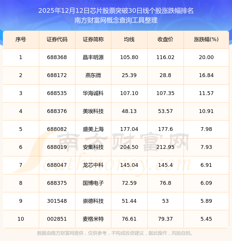 根据南方财富网概念查询工具数据统计,截止2025年12月12日收盘,芯片股票共有25只个股收盘价向上突破了30日线。其中涨幅较大的个股有晶丰明源、燕东微、华海诚科等,涨幅分别为20.00%、16.84%、11.57%。