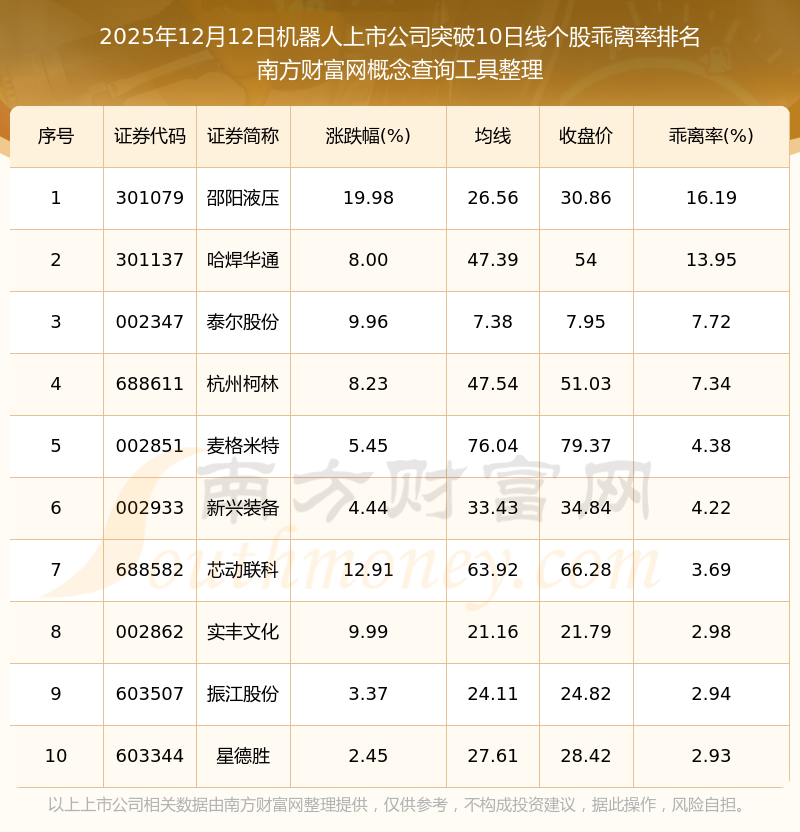 2025年12月12日机器人上市公司突破10日线个股乖离率排名