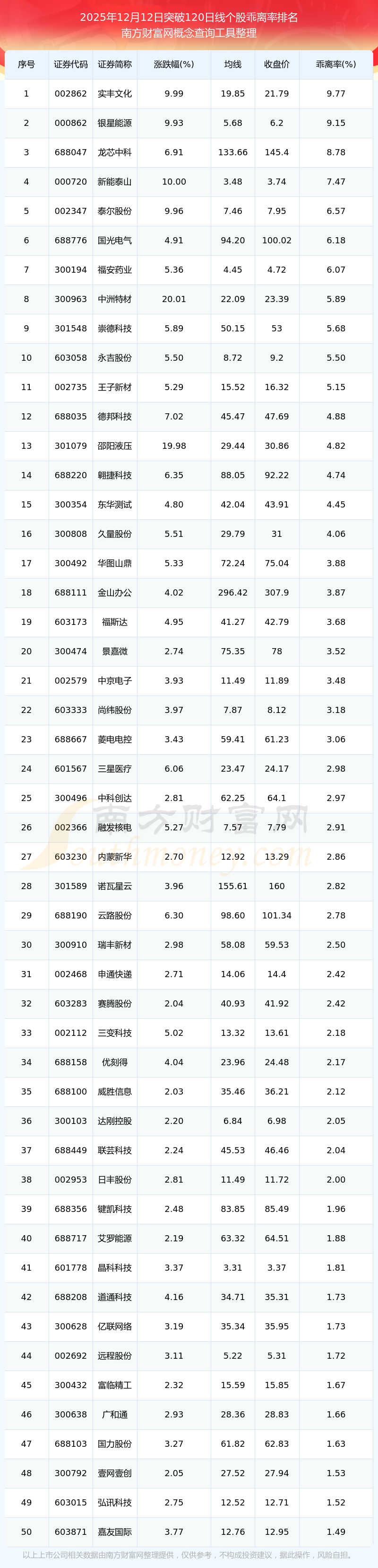 根据南方财富网概念查询工具数据统计,截止2025年12月12日收盘,共有75只个股收盘价向上突破了120日线,其中乖离率较大的个股有实丰文化、银星能源、龙芯中科、新能泰山、泰尔股份等,乖离率分别为9.77%、9.15%、8.78%、7.47%、6.57%。