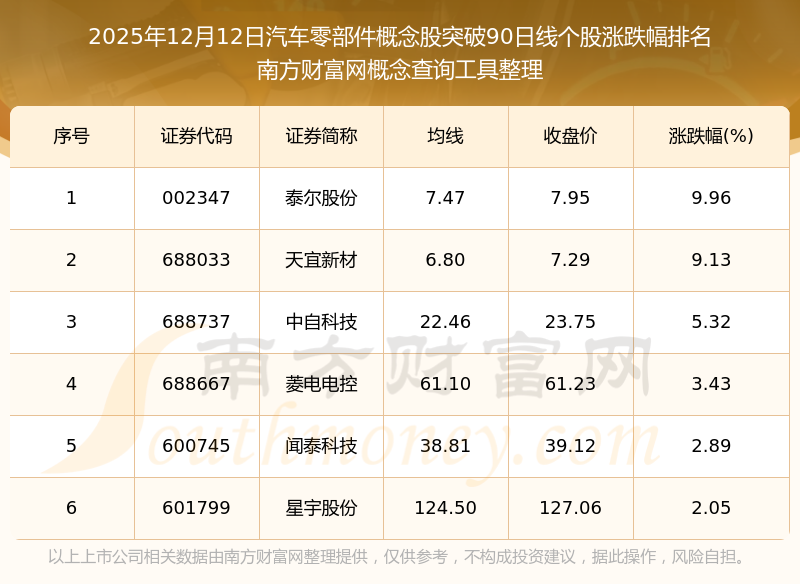根据南方财富网概念查询工具数据统计,截止2025年12月12日收盘,汽车零部件概念股共有6只个股收盘价向上突破了90日线。其中涨幅较大的个股有泰尔股份、天宜新材、中自科技等,涨幅分别为9.96%、9.13%、5.32%。