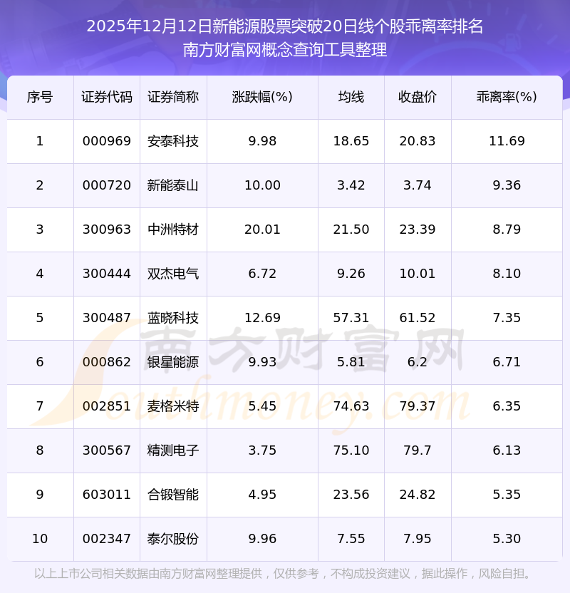 根据南方财富网概念查询工具数据统计,截止2025年12月12日收盘,新能源股票共有35只个股收盘价向上突破了20日线。其中乖离率较大的个股有安泰科技、新能泰山、中洲特材等,乖离率分别为11.69%、9.36%、8.79%。