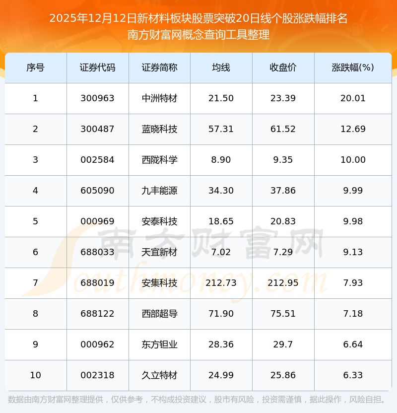 根据南方财富网概念查询工具数据统计,截止2025年12月12日收盘,新材料板块股票共有23只个股收盘价向上突破了20日线。其中涨幅较大的个股有中洲特材、蓝晓科技、西陇科学等,涨幅分别为20.01%、12.69%、10.00%。