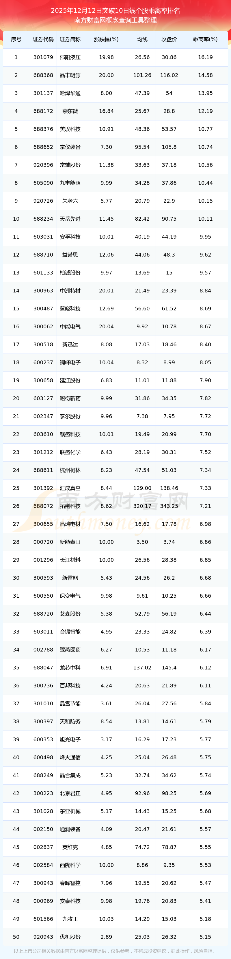 根据南方财富网概念查询工具数据统计,截止2025年12月12日收盘,共有225只个股收盘价向上突破了10日线,其中乖离率较大的个股有邵阳液压、晶丰明源、哈焊华通、燕东微、美埃科技等,乖离率分别为16.19%、14.58%、13.95%、12.19%、10.77%。
