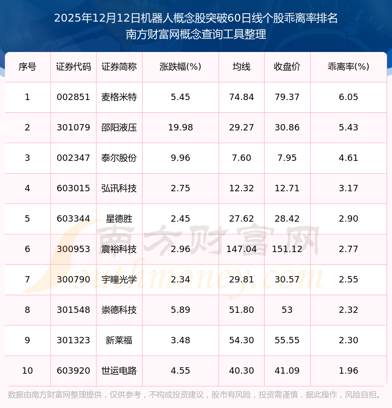 2025年12月12日机器人概念股突破60日线个股乖离率排名