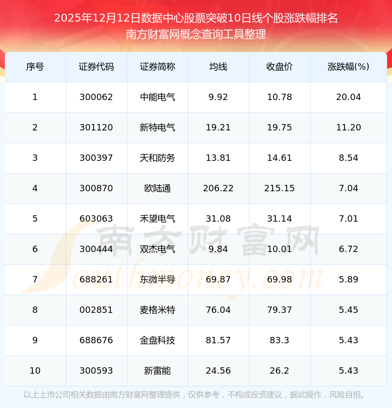 根据南方财富网概念查询工具数据统计,截止2025年12月12日收盘,数据中心股票共有32只个股收盘价向上突破了10日线。其中涨幅较大的个股有中能电气、新特电气、天和防务等,涨幅分别为20.04%、11.20%、8.54%。
