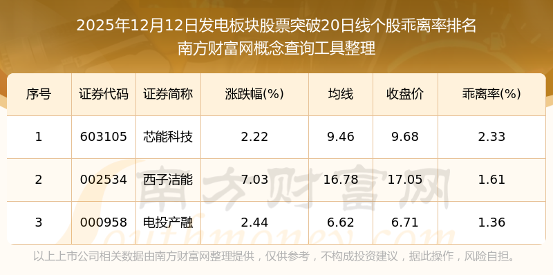 根据南方财富网概念查询工具数据统计,截止2025年12月12日收盘,发电板块股票共有3只个股收盘价向上突破了20日线。其中乖离率较大的个股有芯能科技、西子洁能、电投产融等,乖离率分别为2.33%、1.61%、1.36%。