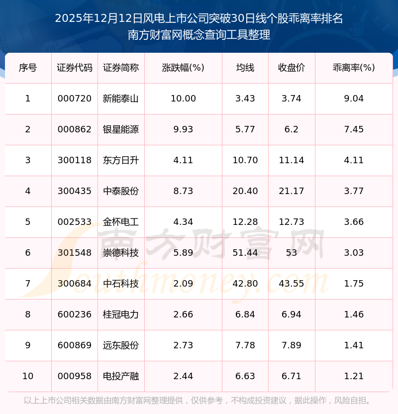 2025年12月12日风电上市公司突破30日线个股乖离率排名