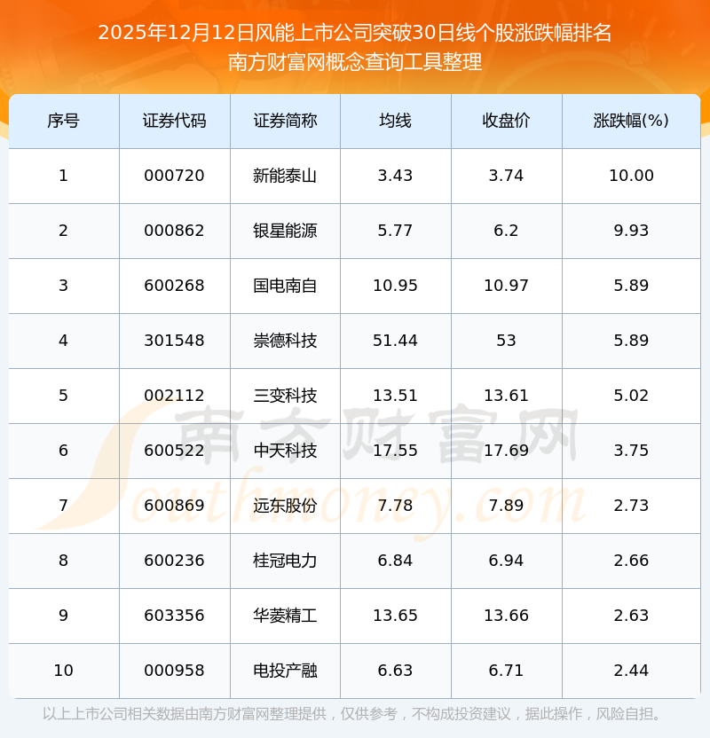 根据南方财富网概念查询工具数据统计,截止2025年12月12日收盘,风能上市公司共有12只个股收盘价向上突破了30日线。其中涨幅较大的个股有新能泰山、银星能源、国电南自等,涨幅分别为10.00%、9.93%、5.89%。