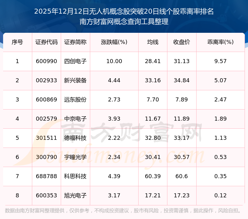 根据南方财富网概念查询工具数据统计,截止2025年12月12日收盘,无人机概念股共有8只个股收盘价向上突破了20日线。其中乖离率较大的个股有四创电子、新兴装备、远东股份等,乖离率分别为9.57%、5.07%、2.47%。