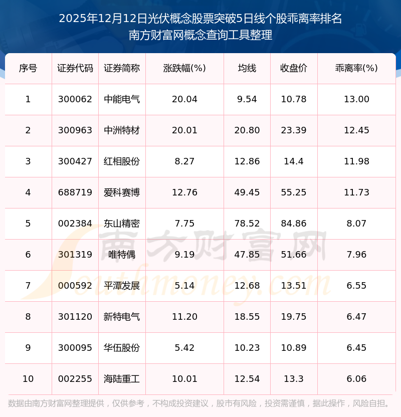 根据南方财富网概念查询工具数据统计,截止2025年12月12日收盘,光伏概念股票共有55只个股收盘价向上突破了5日线。其中乖离率较大的个股有中能电气、中洲特材、红相股份等,乖离率分别为13.00%、12.45%、11.98%。
