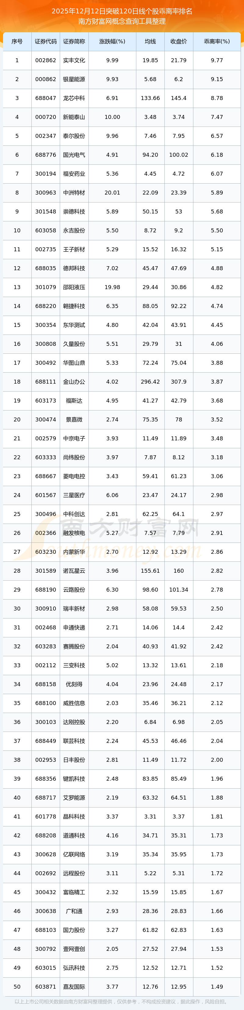 根据南方财富网概念查询工具数据统计,截止2025年12月12日收盘,共有75只个股收盘价向上突破了120日线,其中乖离率较大的个股有实丰文化、银星能源、龙芯中科、新能泰山、泰尔股份等,乖离率分别为9.77%、9.15%、8.78%、7.47%、6.57%。