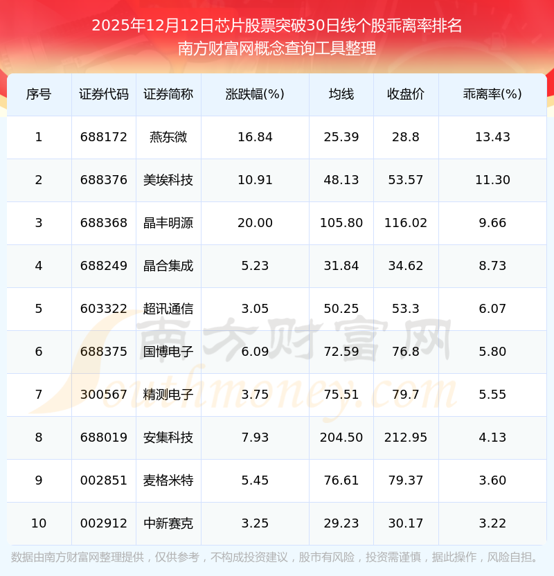 根据南方财富网概念查询工具数据统计,截止2025年12月12日收盘,芯片股票共有25只个股收盘价向上突破了30日线。其中乖离率较大的个股有燕东微、美埃科技、晶丰明源等,乖离率分别为13.43%、11.30%、9.66%。